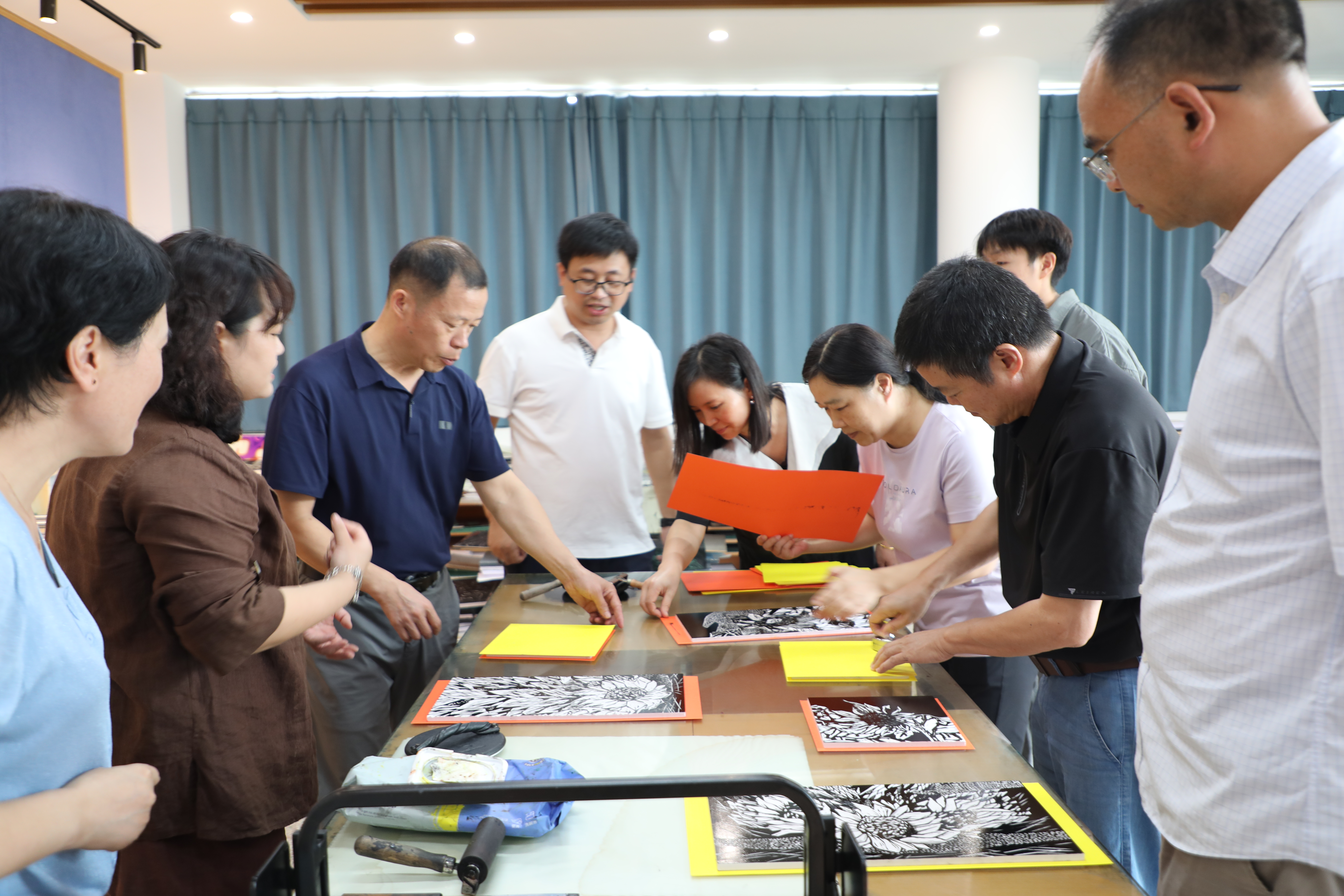 调研组一行跟随学校相关负责人参观了尚美艺术长廊、教工之家、工会活动室、教师版画创作室、妈咪小屋、版画展览馆及体育馆等功能区域,详细了解了各阵地的功能设计与使用情况。调研组在版画创作室体验版画制作,感受学校特色文化;在体育馆观摩并参与嗒嗒球运动,与教职工亲切交流,现场气氛融洽。